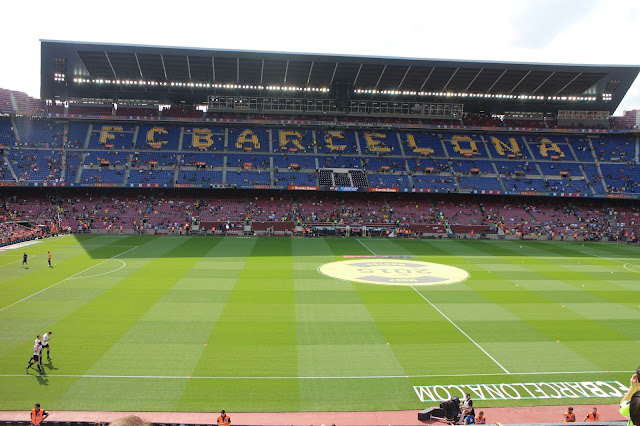 Pelin aikana mies syödä mussutti taukoamatta, kun ei voinut huudella mitään Barçan kannattajien keskellä. Minä puolestaan keksin melko pian, että kunhan en sano mitään "avainsanoja", pystyn kommentoimaan äänekkäämminkin peliä suomeksi! Vieressäni istunut mies oli lievästi sanottuna ymmällään, kun välillä keskustelimme mieheni kanssa espanjaksi mitä illalla tehtäisiin ja hetken päästä huusin kurkku suorana: "Hyvä keltainen ukkeli!! Punainen ukkeli filmaa!! Puusilmä tuomari!! Selvä paitsio!!"